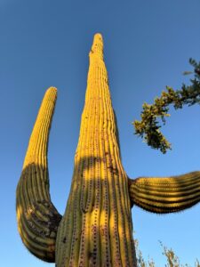While visiting Arizona’s Saguaro National Forest, you can view miles of these cacti dominating the landscape, creating a breathtaking desert ecosystem. The forest is divided into two districts near Tucson, where saguaros grow alongside mesquite trees, barrel cactus, the friendly touchy pokey jumping cholla (they never fail to give me their love and attention! Ouchy!), palo verdes, and a variety of desert wildlife. Each cactus begins life as a tiny seed, often sheltered under a “nurse plant” that provides shade and protection. Over decades, they develop their iconic arms, which help balance water storage and reproduction. Visiting the forest offers a glimpse into this slow, resilient growth process—a reminder of nature’s ability to adapt and flourish in even the harshest environment.